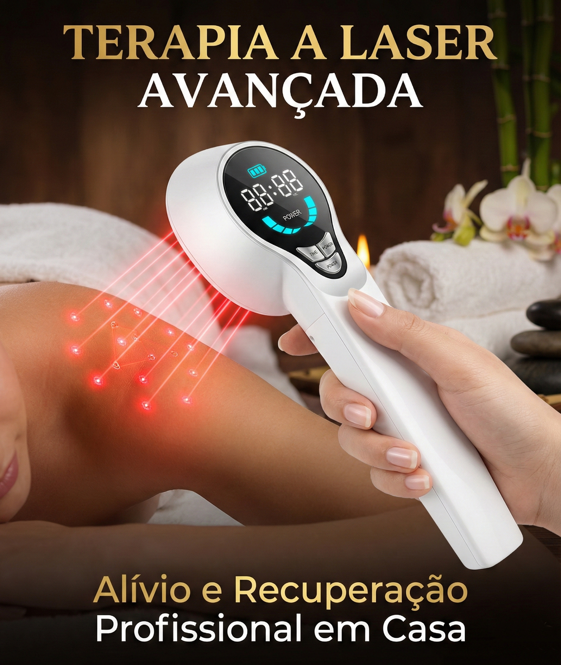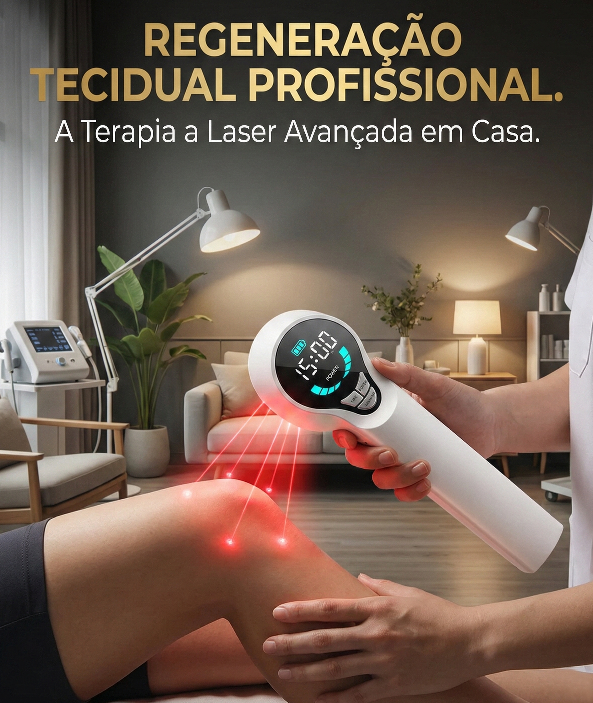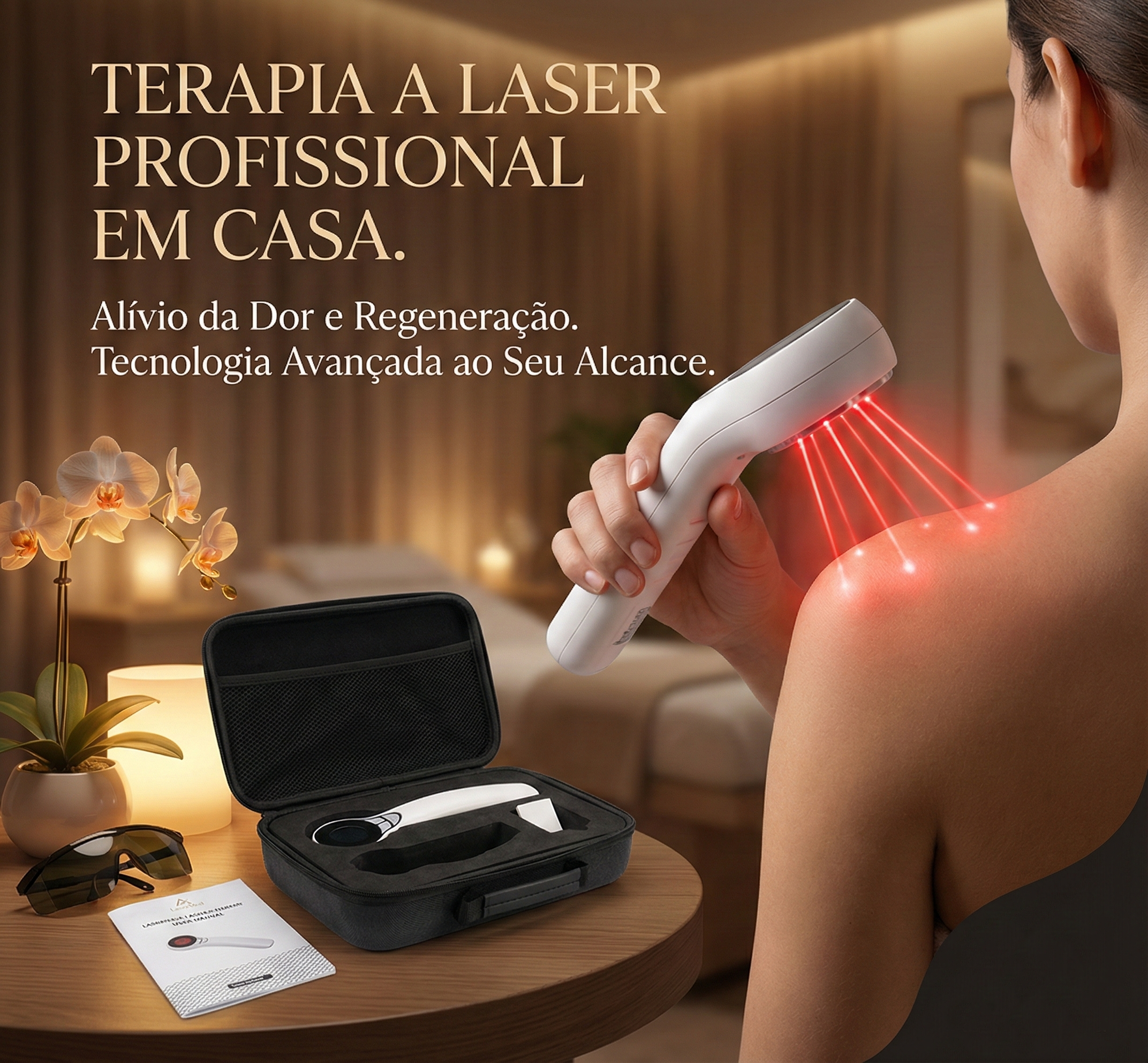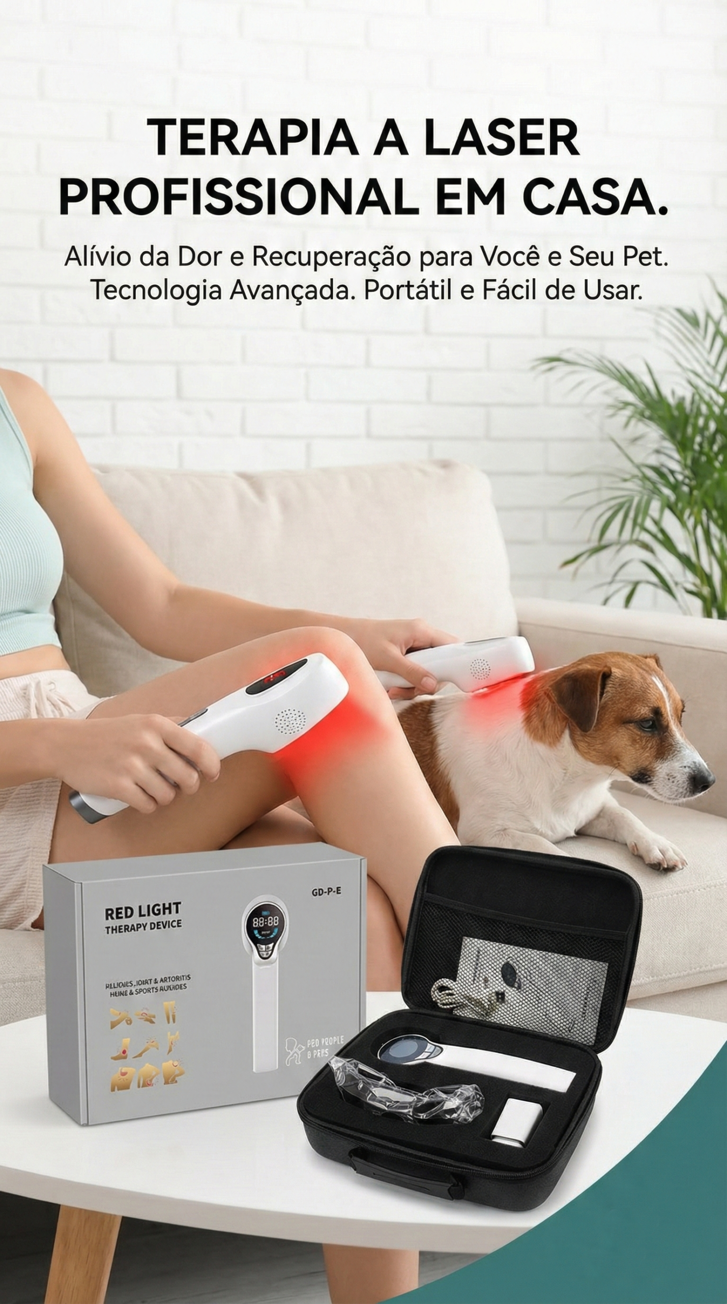 O nosso dispositivo portátil de terapia a laser foi desenvolvido para oferecer alívio imediato, combinando tecnologia moderna com praticidade. Compacto, elegante e fácil de usar, ele vem equipado com visor digital intuitivo para que você tenha total controle do seu tratamento no conforto da sua casa.